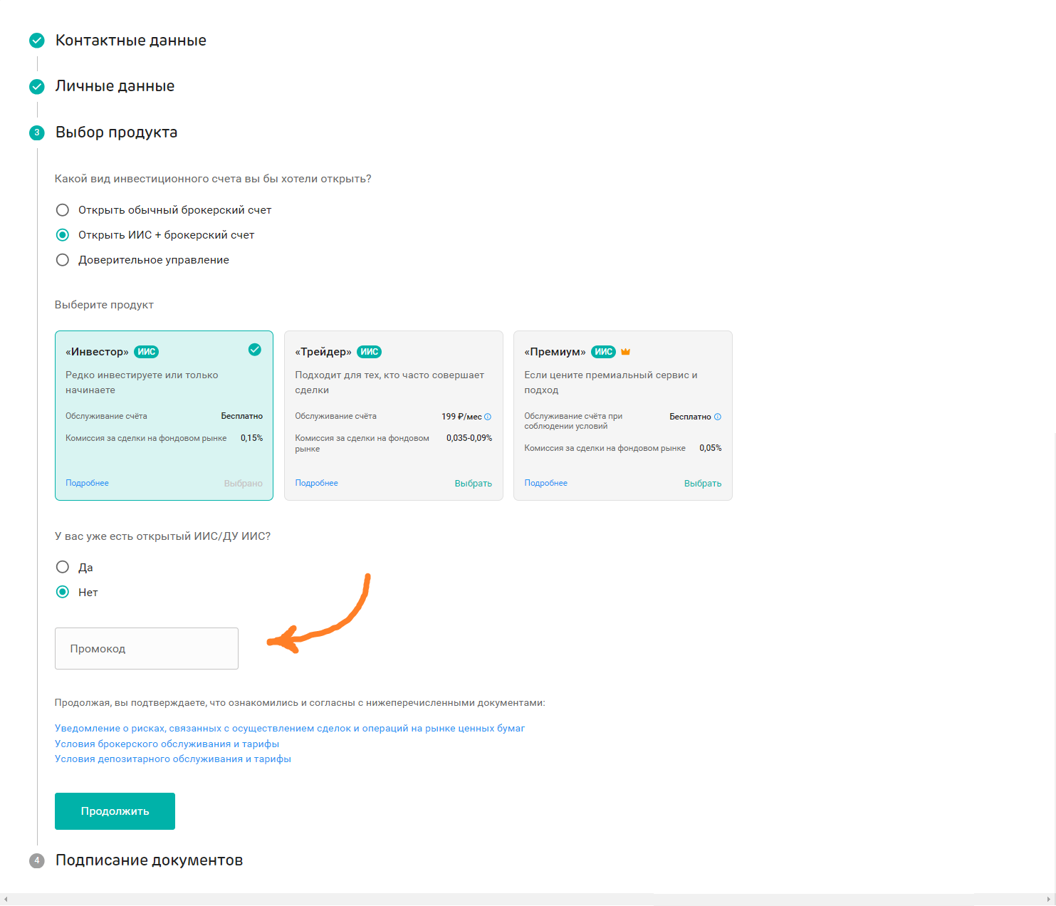 Поле "промокод" указывается во время открытия счета в анкете на 3 шаге "Выбор продукта". Его нужно обязательно указать для зачисления акций ПАО "Татнефть" на ваш инвестиционный счет.